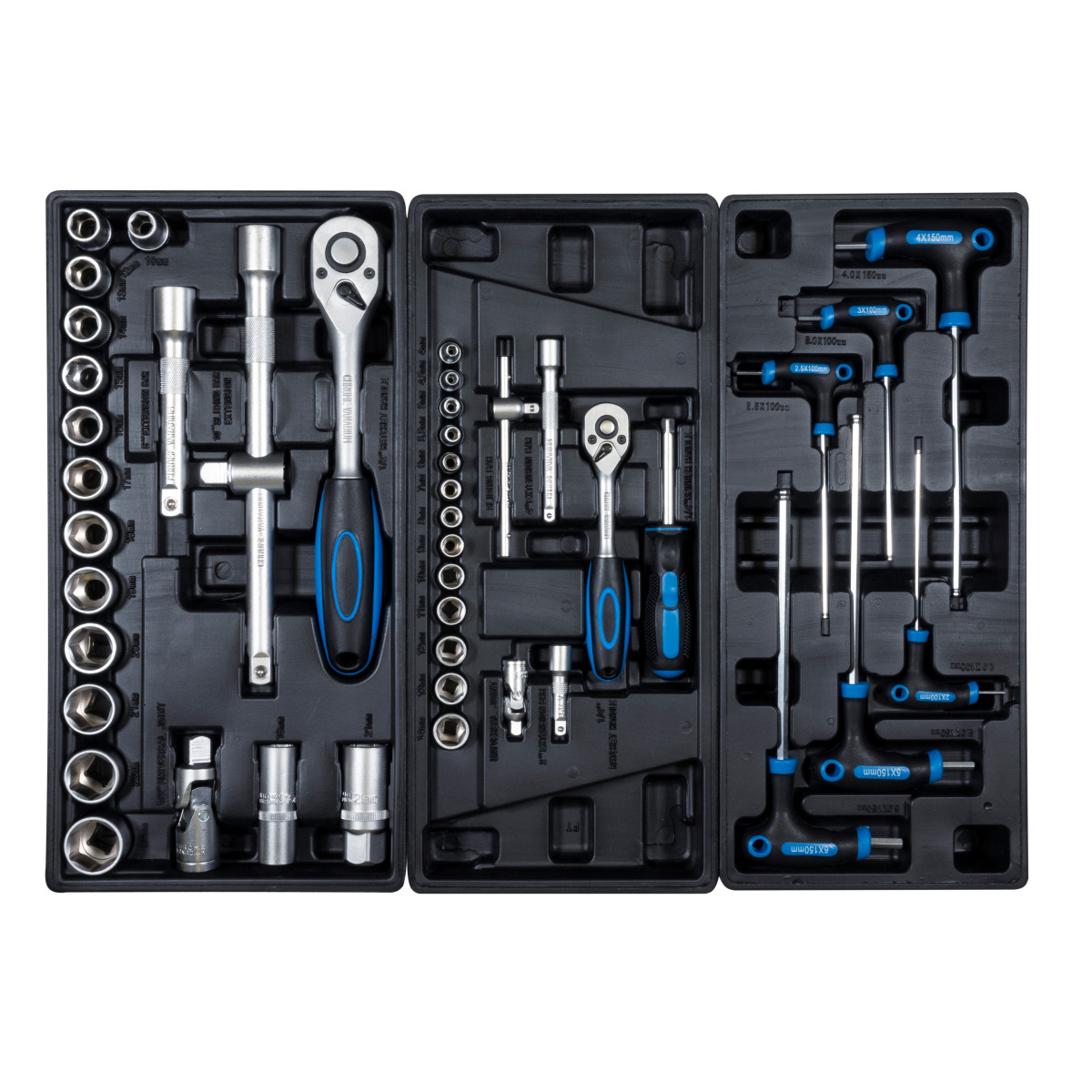 - 1. Auszug: 2 Umschaltknarren 1/2|1/4 (Länge 26/14,5 cm), 3 Stk Verlängerung 1/2|1/4|Länge 12,5/10/5 cm), 1 Schraubendreher 1/4 (Länge 11 cm), 2 Stk Steckschlüsseleinsätze lang 1/2 (Länge 16 + 21 mm), 2 Stk Kardangelenk 1/2|1/4, 26